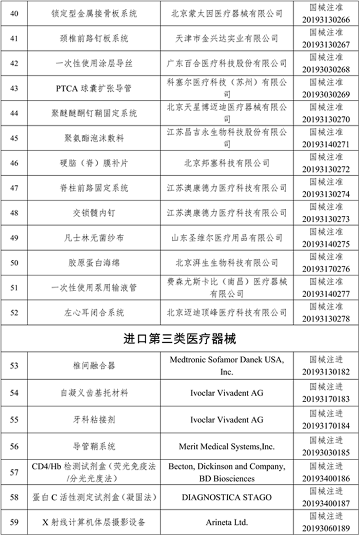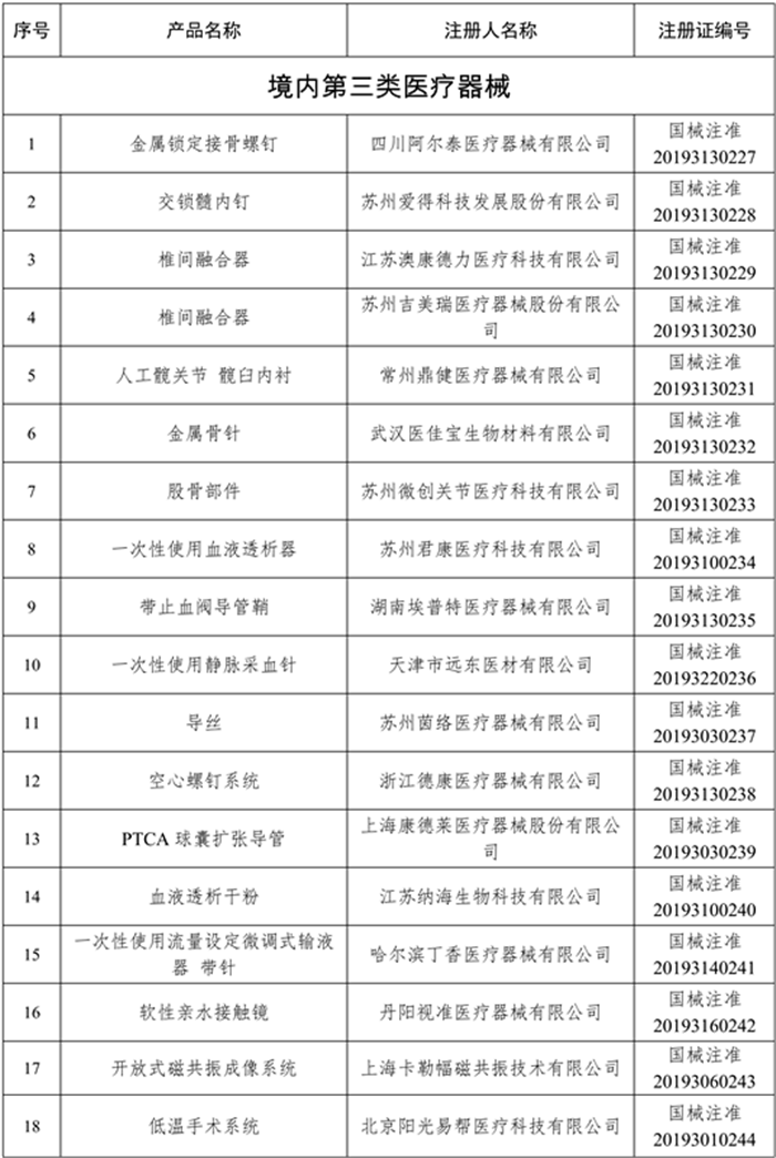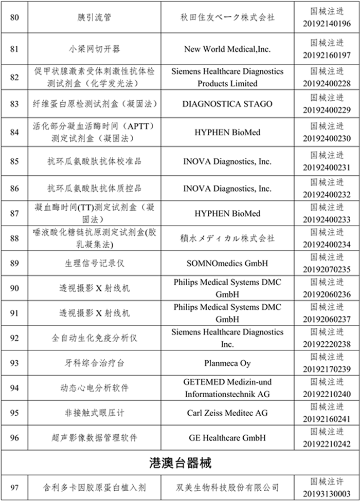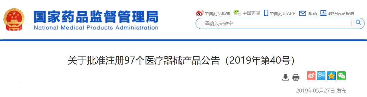 2019年4月,国家药品监督管理局共批准注册医疗器械产品97个。其中,境内第三类医疗器械产品52个,进口第三类医疗器械产品26个,进口第二类医疗器械产品18个,港澳台1个。