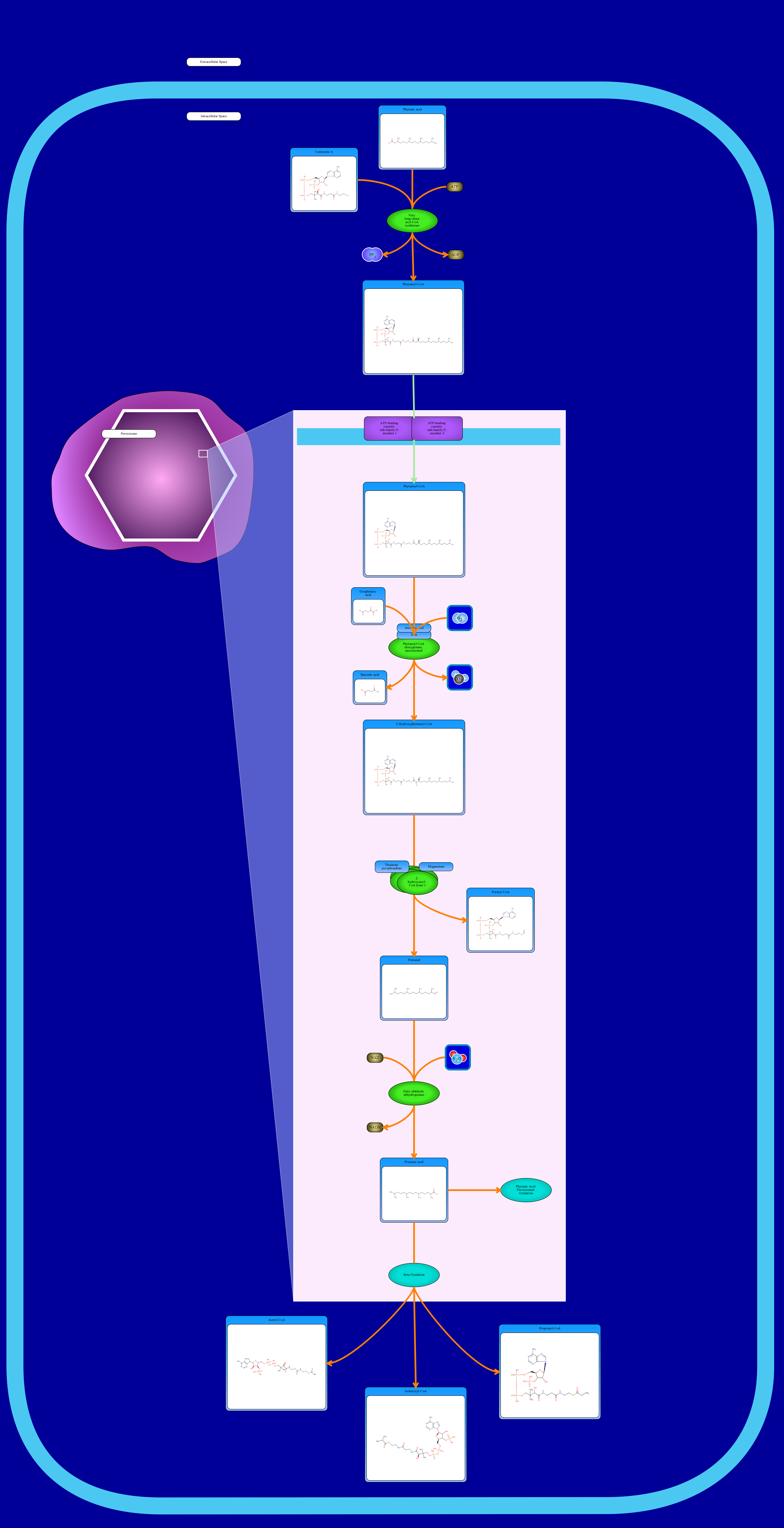 Phytanic acid, a branched chain fatty acid, is an important component of fatty acid intake, occuring in meat, fish and dairy products. Due to its methylation, it cannot be a substrate for acyl-CoA dehydrogenase and cannot enter the mitochondrial beta oxidation pathway. Phytanic acid is instead activated to its CoA ester form by a CoA synthetase to phytanoyl-CoA, where it can begin the first cycle of alpha oxidation. Phytanoyl-CoA is a substrate for a specific alpha-hydroxylase (Phytanoyl-CoA hydroxylase), which adds a hydroxyl group to the α-carbon of phytanic acid, creating the 19-carbon homologue, pristanic acid. Pristanic acid then undergoes further metabolism through beta oxidation.