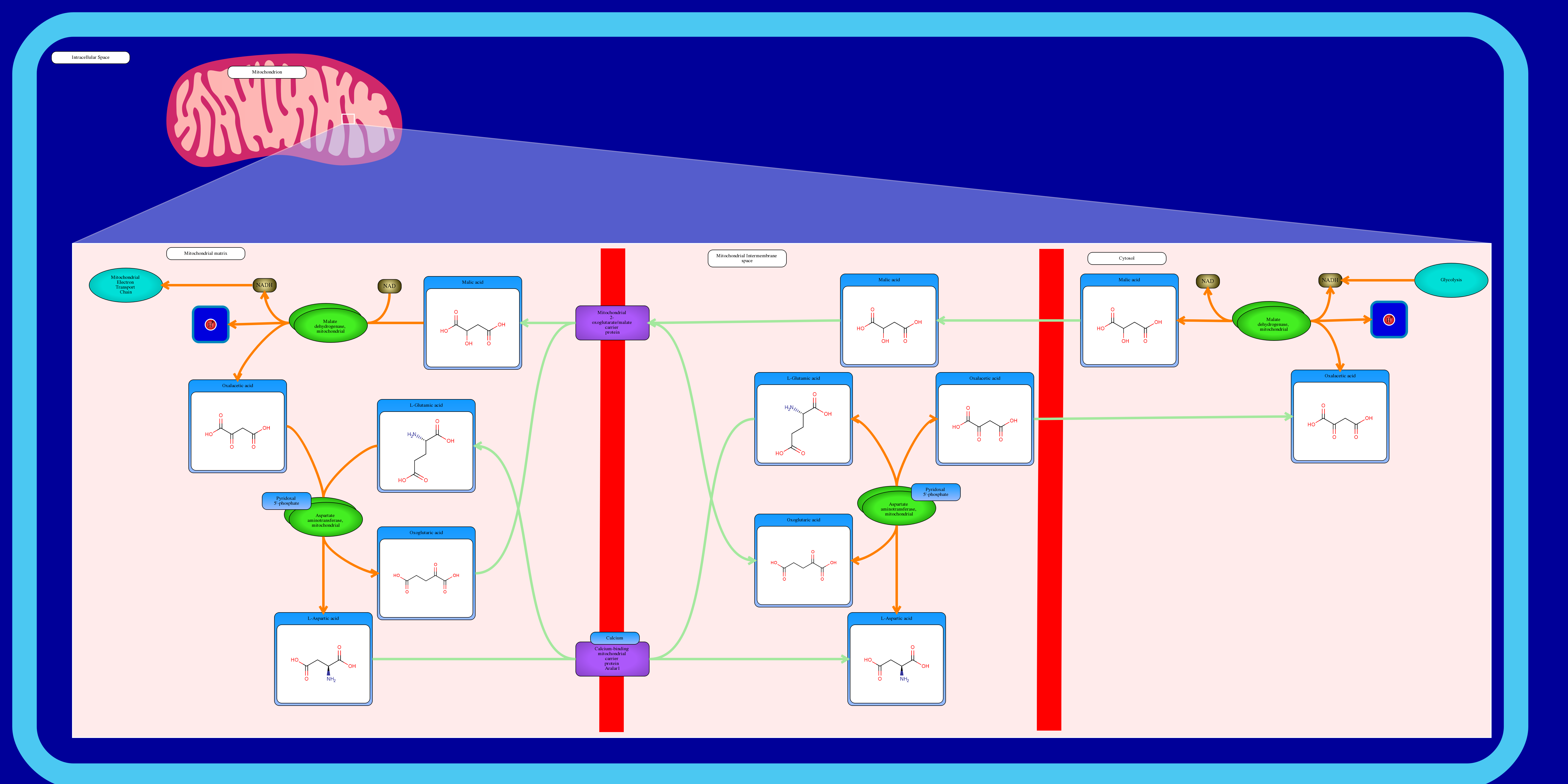 The malate-aspartate shuttle (also known as the malate shuttle) is used by mitochondria for translocating electrons produced during glycolysis across the impermeable inner membrane for oxidative phosphorylation. This allows the hydrogen ions of the cofactor NADH produced in the cytosol to reach the electron transport chain in the mitochondria and generate ATP. The shuttle system is required because the inner membrane is impermeable to NADH and its oxidized form NAD+. NAD+/NADH does not cross the membrane, only ions (attached to malate) cross it. In this particular shuttle process, oxaloacetate on the cytoplasmic side is first reduced by NADH, creating malate and NAD+. Malate and the electrons it carries are transported into the mitochondria across the inner mitochondrial membrane, in exchange for alpha-ketoglutarate, which is transported out of the mitochondria. Once inside, the energy in malate is extracted again by reducing NAD+ to make NADH, thereby regenerating oxaloacetate. This NADH is then free to transfer its electrons to the electron transport chain. The oxaloacetate is transaminated with glutamate to make aspartate and alpha-ketoglutarate. Aspartate is returned to the cytosol by the aspartate-glutamate transporter, which moves glutamate into the mitochondria as it transports aspartate out. The net result is that NADH is transported into the mitochondria, generating 3 ATP molecules for every NADH transported in from the cytosol.